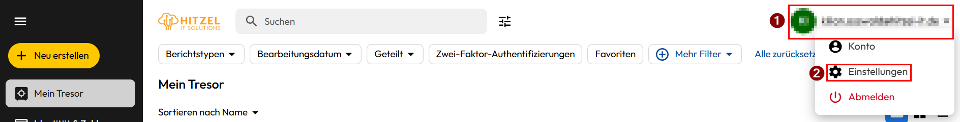 Sollten Sie bereits geschäftliche Passwörter in einem anderen Keeper Account, im Browser oder einem anderen Passwort Manager gespeichert haben und diese übernehmen wollen, können Sie dies durch klicken auf Ihre E-Mail Adresse (1) im oberen rechten Bereich ihres Web-Tresors tun. Klicken Sie anschließend auf den Reiter "Einstellungen" (2).