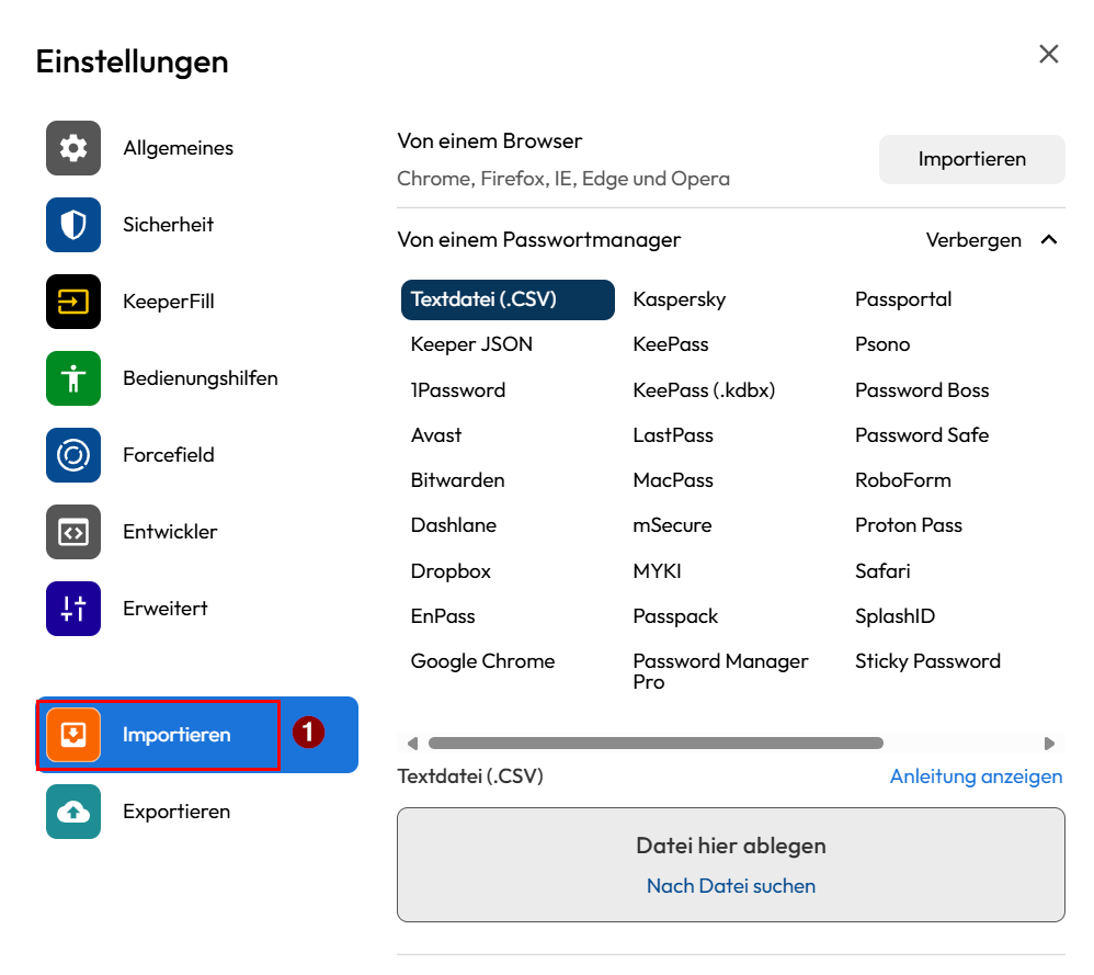 Es öffnen sich nun die Einstellungen, klicken Sie im linken unteren Bereich auf "Importieren" (1), es öffnet sich nun die Import-Übersicht von Keeper.