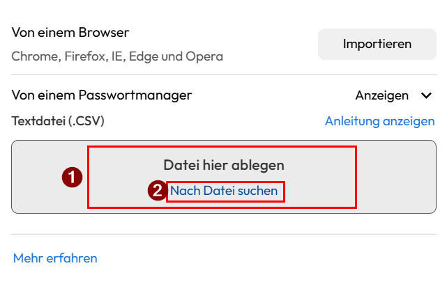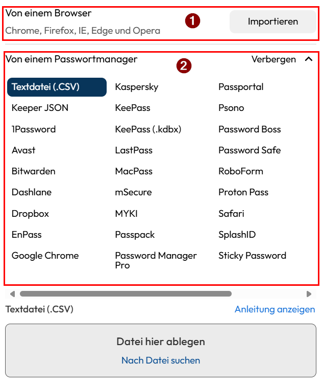 Haben Sie den richtigen Manager ausgewählt, können sie nun entweder, die Datei mit ihrem Passwörtern, einfach in den grauen Kasten mit "Datei hier ablegen" (1) hineinziehen, oder aber mit klicken auf "Nach Datei suchen" (2), normal Ihre PC Dateien durchsuchen und die richtige Datei auswählen und hochladen.