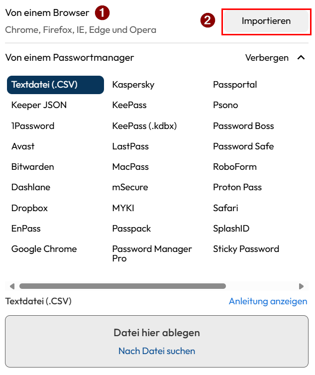 möchten Sie Passwörter aus dem Browser importieren, klicken Sie neben dem Abschnitt "Von einem Browser" (1) auf "Importieren" (2).
