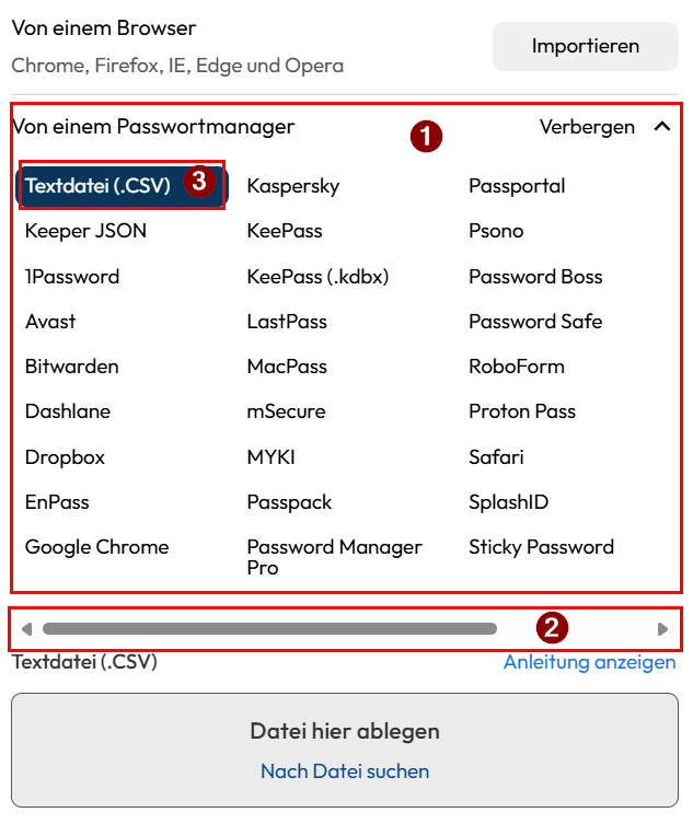 Im Abschnitt "Von einem Passwortmanager" (1) sehen Sie alle Passwortmanager, welche mit Keeper kompatibel sind. Sollten Sie Ihren Manager nicht finden können Sie weiter unten mit nach rechts schieben der Leiste (2), weitere Dienste auswählen. Sollte Ihr Dienst nicht hinterlegt sein, dieser aber dennoch .csv Dateien ausgeben, können Sie dies durch Auswählen von "Textdatei (.CSV)" (3) dennoch einfügen.